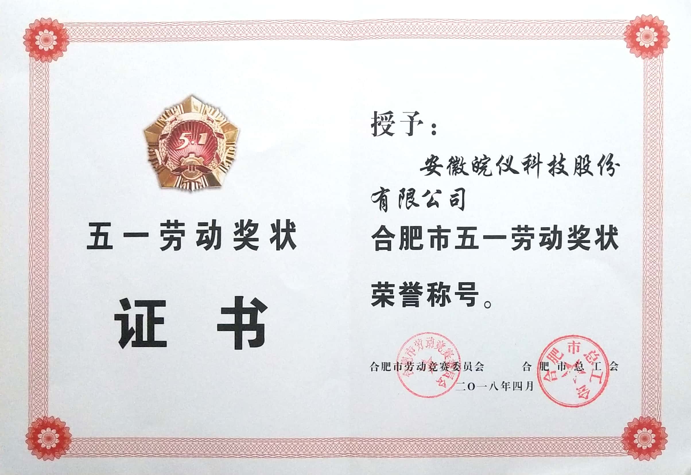 4月皖仪科技荣获“合肥市五一劳动奖状”荣誉称号