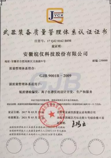 2017年3月23日皖仪科技成功获得《武器装备质量管理体系认证证书》,这标志着我司严格按照国家军用标准GJB9001B-2009的要求,通过了质量管理体系认证,符合武器装备质量管理体系的标准及相关要求,具备相关领域军品研发生产的能力,我司质量体系适用于:氦质谱检漏仪、离子色谱仪的设计开发、生产和服务。证书有效期自2017年3月23日至2021年3月22日。