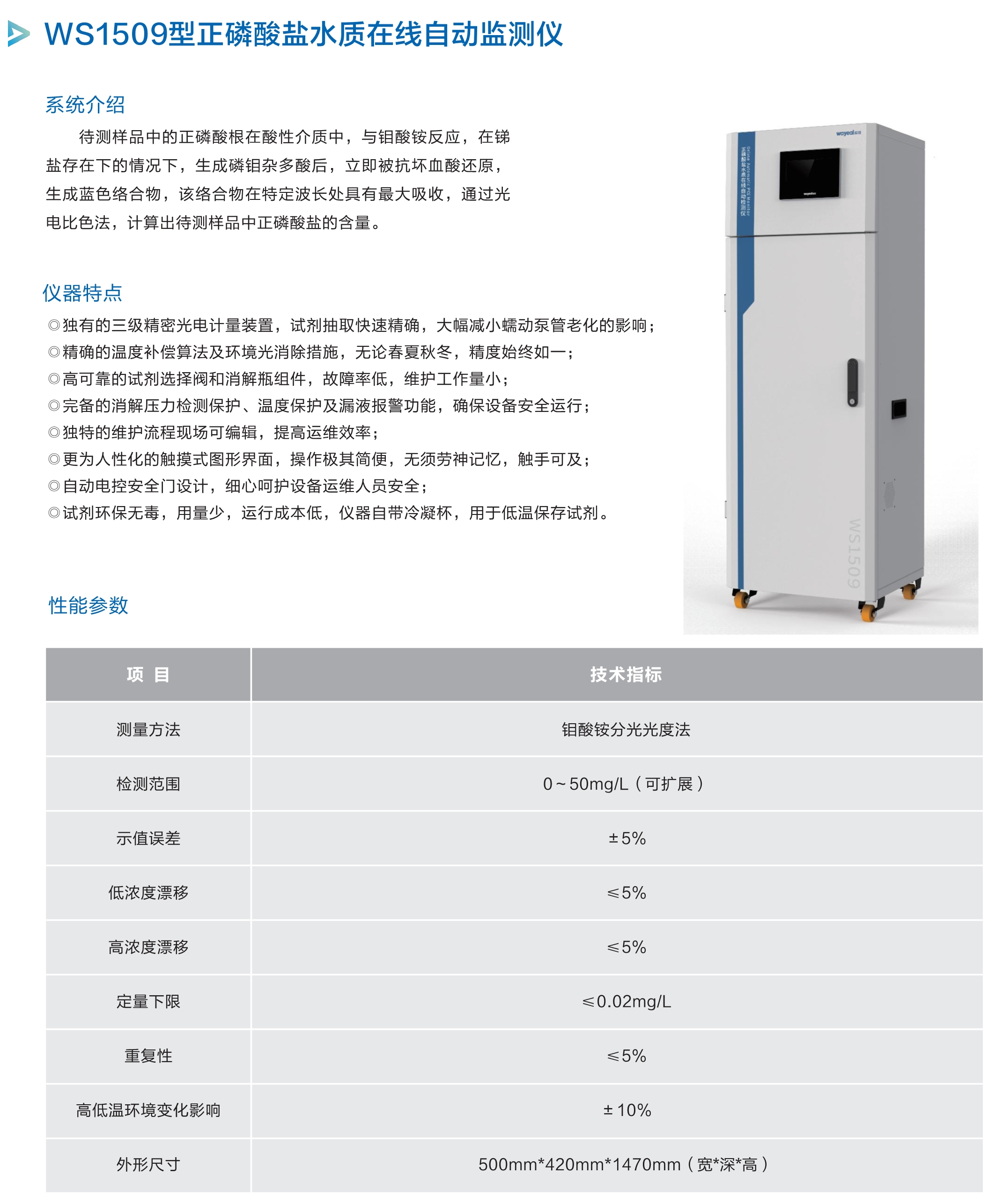 待测样品中的正磷酸根在酸性介质中,与钼酸铵反应,在锑盐存在下的情况下,生成磷钼杂多酸后,立即被抗坏血酸还原,生成蓝色络合物,该络合物在特定波长处具有最大吸收,通过光电比色法,计算出待测样品中正磷酸盐的含量。
