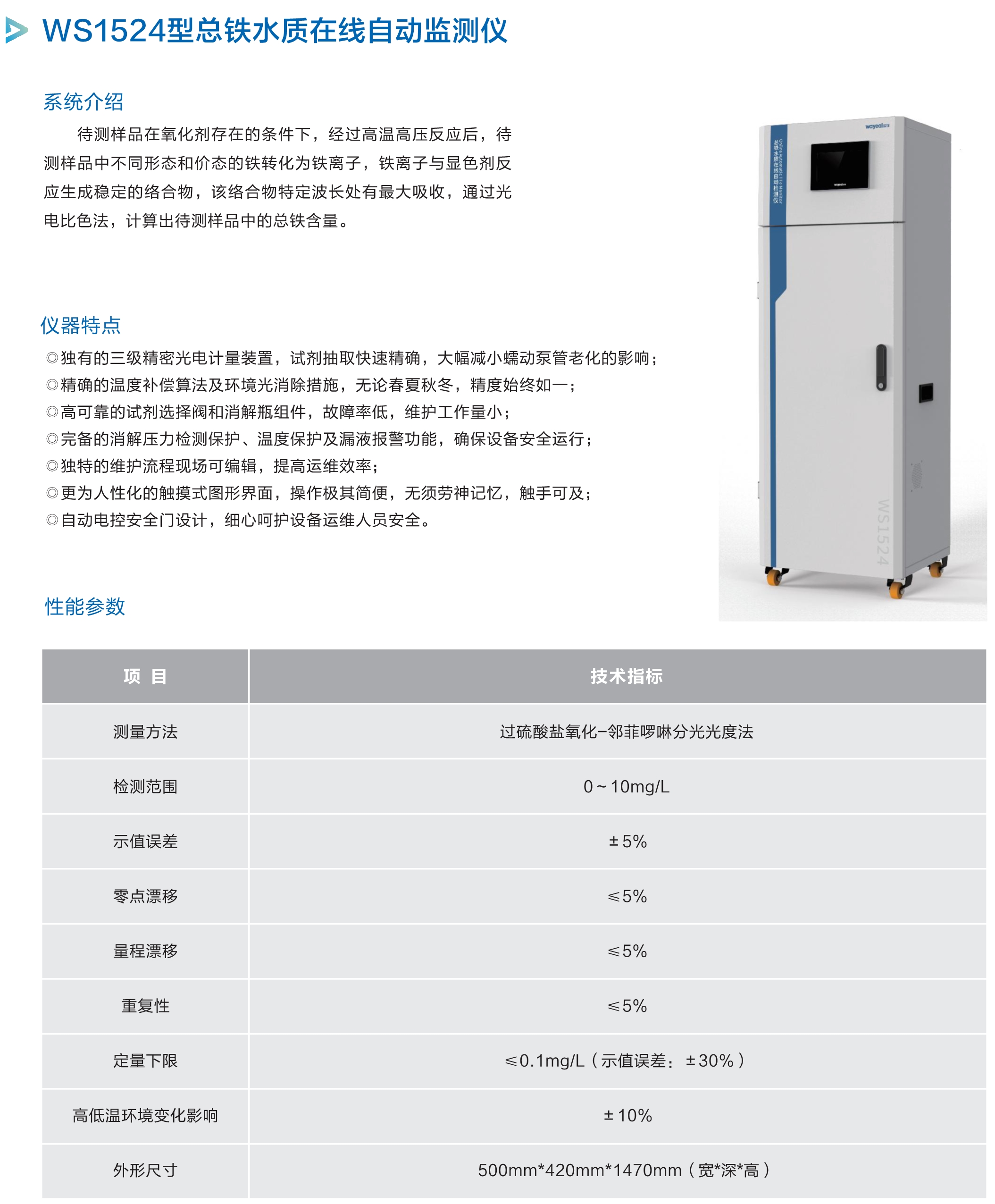 待测样品在氧化剂存在的条件下,经过高温高压反应后,待测样品中不同形态和价态的铁转化为铁离子,铁离子与显色剂反应生成稳定的络合物,该络合物特定波长处有最大吸收,通过光电比色法,计算出待测样品中的总铁含量。
