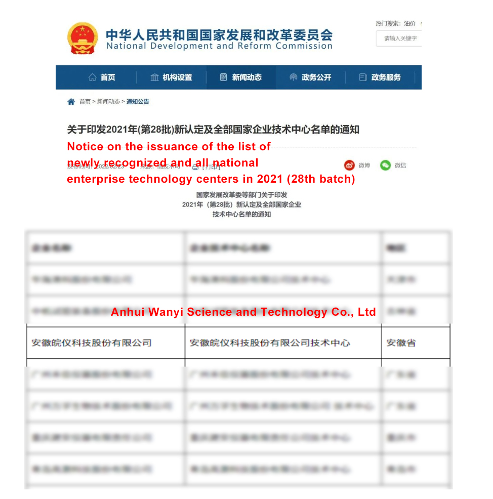 On December 27, 2021, National Development and Reform Commission, Ministry of Science and Technology of the People’s Republic of China, Ministry of Finance of the People's Republic of China, General Administration of Customs of the People’s Republic of China and State Taxation Administration released the "Proposed List of National Enterprise Technology Centers to be Recognized in 2021 (28th Batch)", in this batch of proposed list, only four National Enterprise Technology Centers were newly in Anhui Province, and Anhui Wanyi Science and Technology Co., Ltd was on the list.