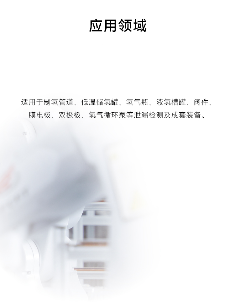 适用于制氢管道、低温储氢罐、氢气瓶、液氢槽罐、阀件、膜电极、双极板、氢气循环泵等泄漏检测及成套装备。